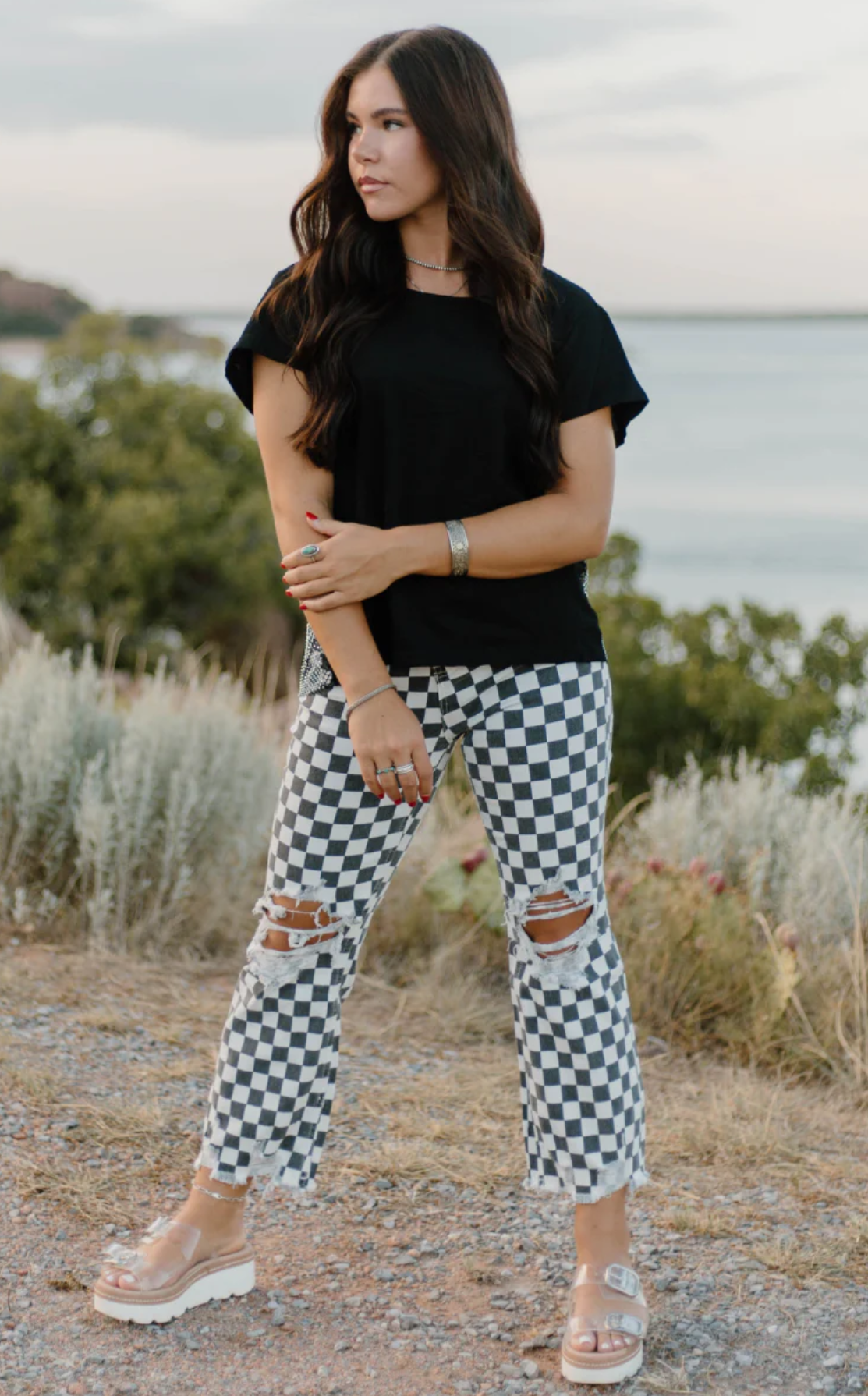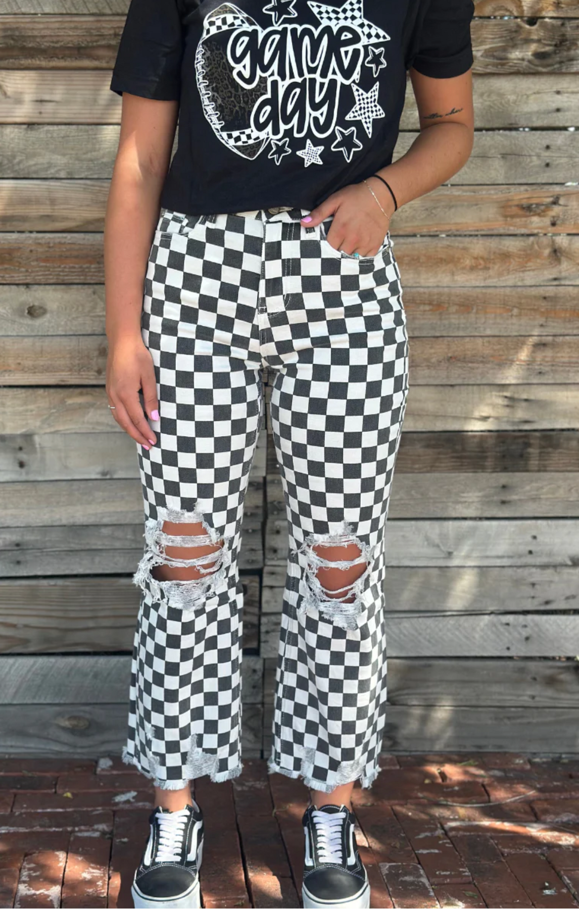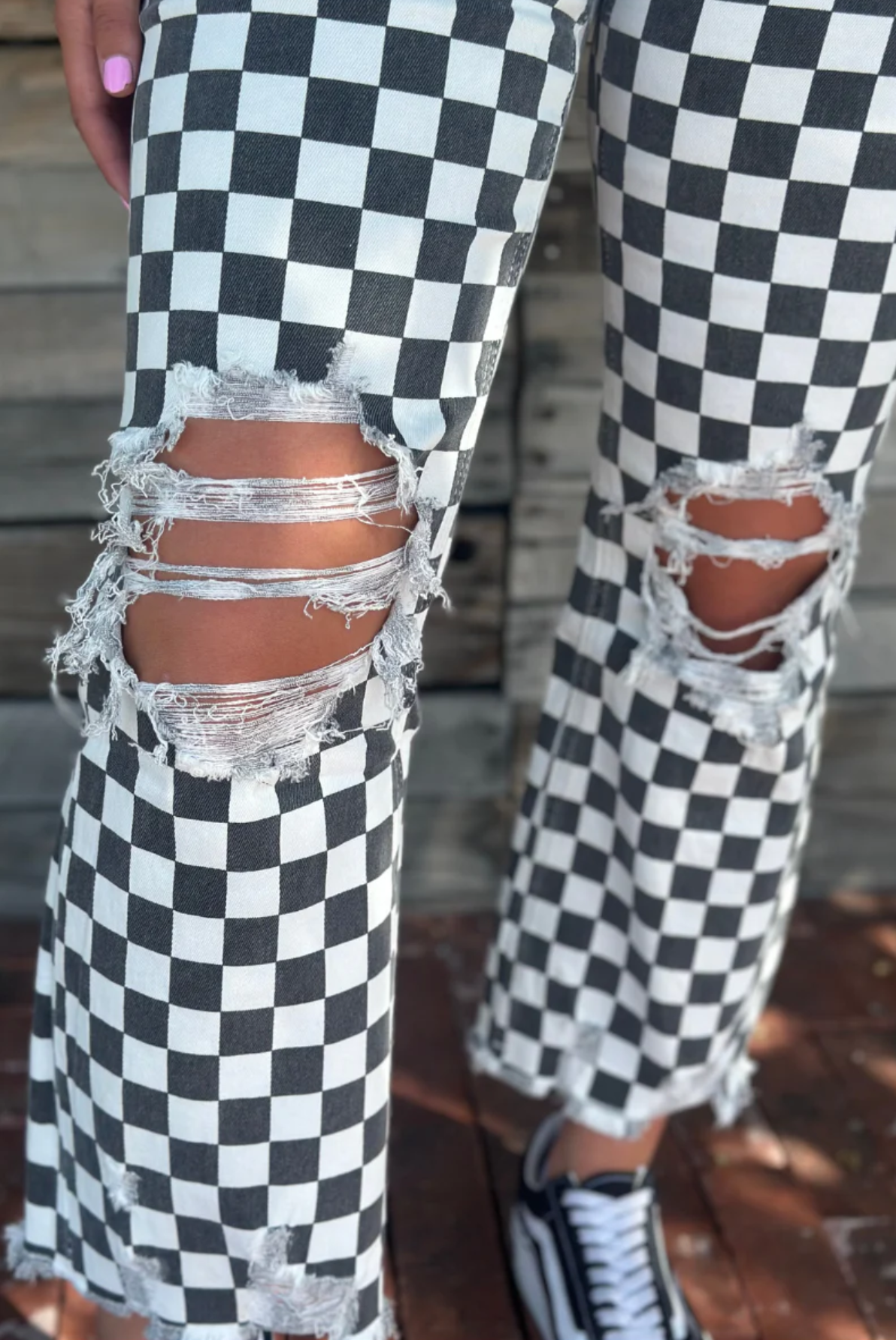 Stand out effortlessly with the Round The Track Jeans, featuring a distinctive faded black and white checkered pattern and stylish distressed holes at the knees. Designed to combine bold fashion with comfort, these jeans are the perfect choice to upgrade your wardrobe and showcase your confident, trend-savvy side.