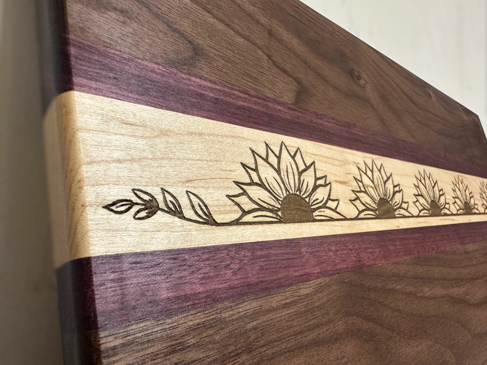 Sunflowers pop against a backdrop of handcrafted walnut and maple, with a touch of purple heartwood. Get ready to be wowed by this unique Bender Board creation, featuring a row of beautifully engraved sunflowers.